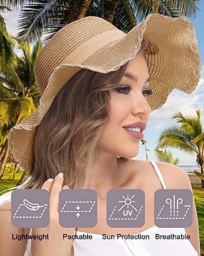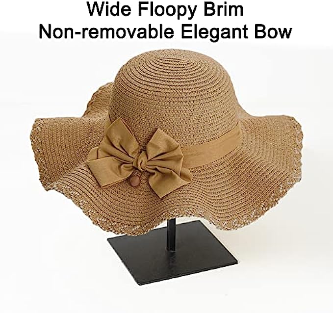 Dolcevida Women Straw Sun Hat Wide Brim UV Protection Beach Hat Summer Floppy Hat with Linen Bow