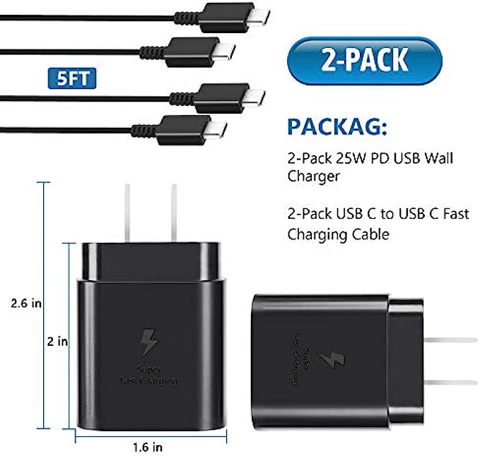 • Package Included: 2 x 25w power delivery wall charger plug, 2 x 5ft type C charging Cord , if there are any quality problem, please contact us