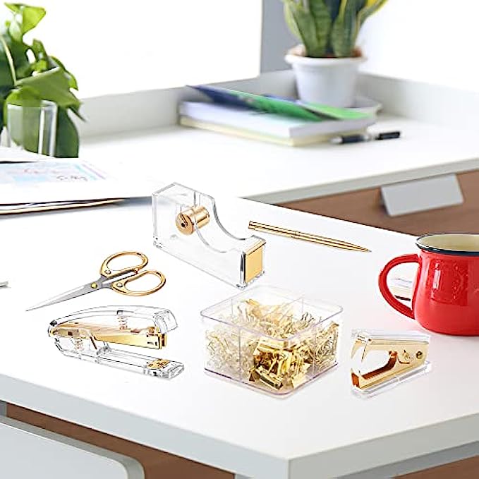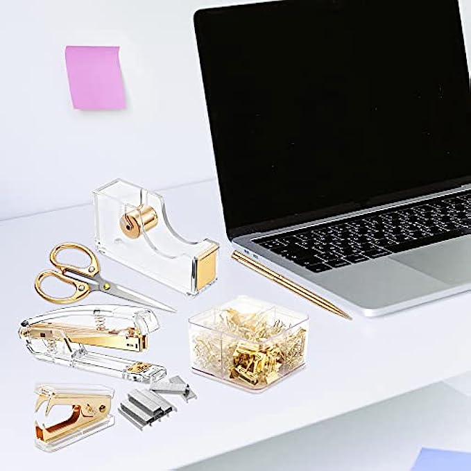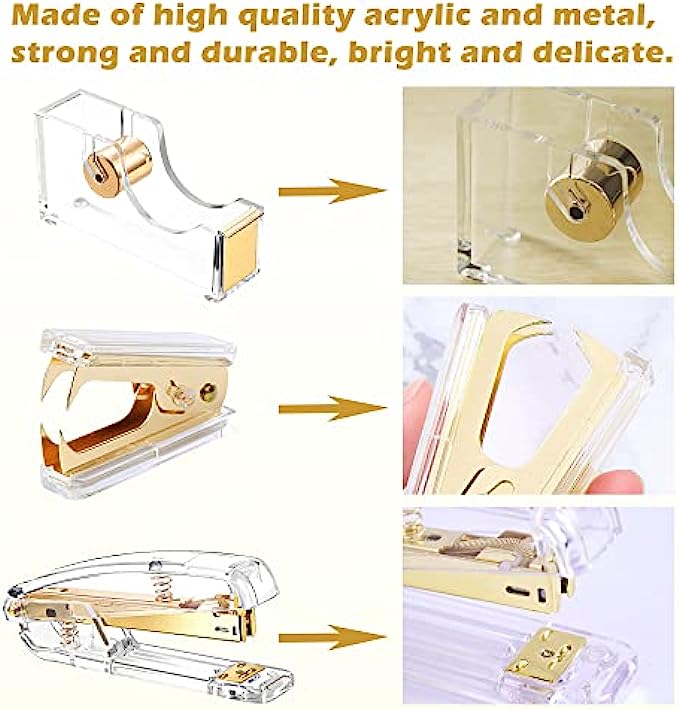 • 【Material】Stapler, Tape Dispenser and Stapler Remover are mainly made of acrylic and metal, smooth and comfortable to the touch, not easy to break, durable. The color is clear and bright, elegant and beautiful, very suitable for desktop office supplies.