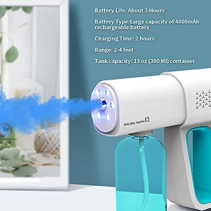 • 【Handheld Wireless Fogger】You can easily clean full rooms in under 5 minutes. More effective than manual hand wiping, pump spraying or mopping. The spraying range is about 2-4 feet. Nano sprayer gun can be sprayed directly on the surface of the human body, fabrics, home appliances and other objects.