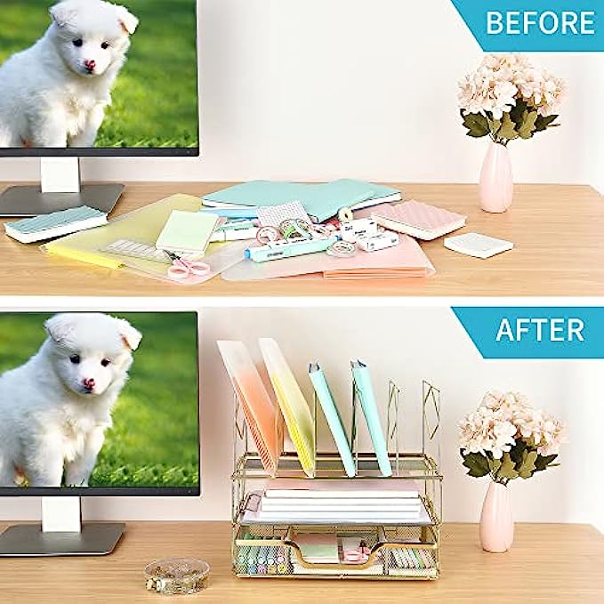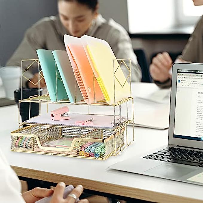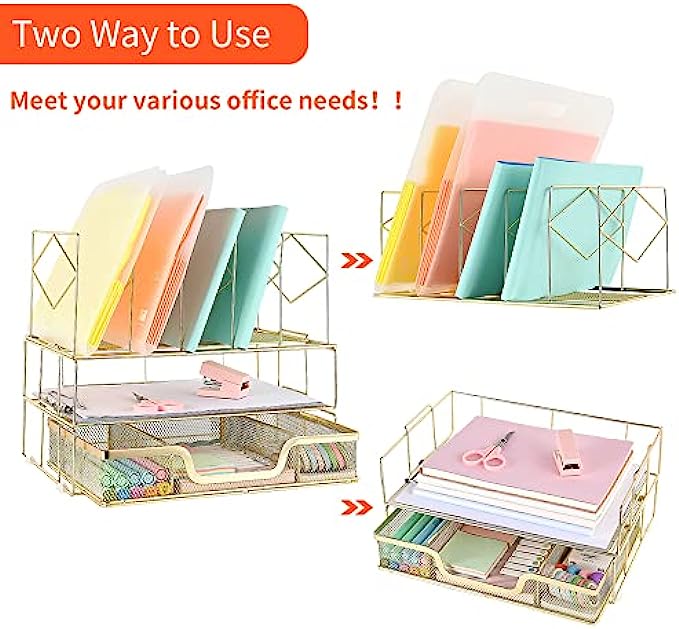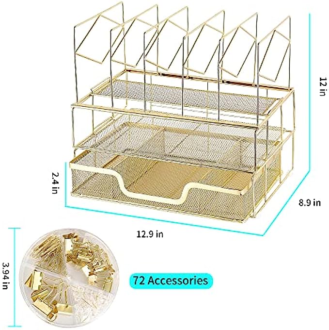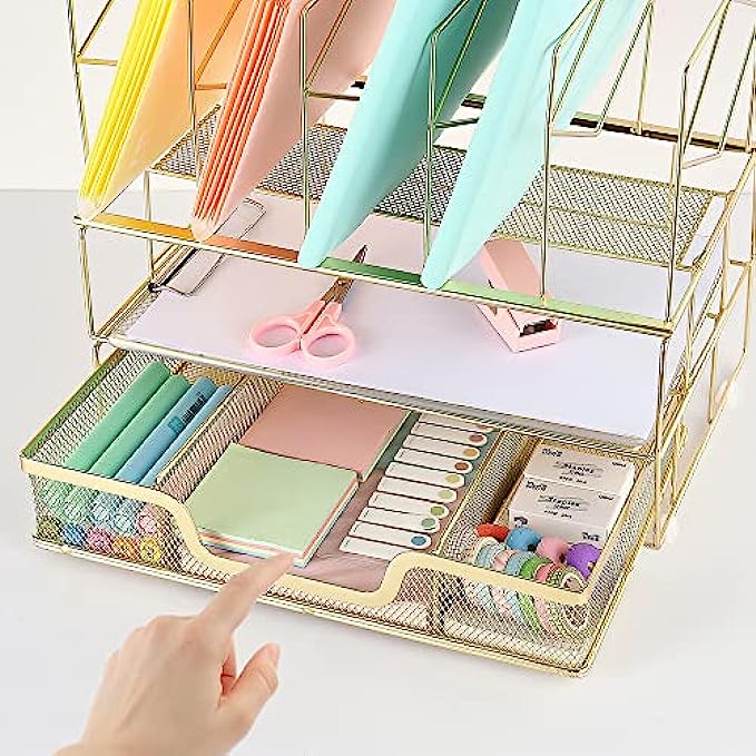 Youbetia Desk Organizers and Accessories - Double Tray and 5 Upright Sections, Office Supplies Desk Organizer with Drawer, File Office Organization with Binder Clips, Gold