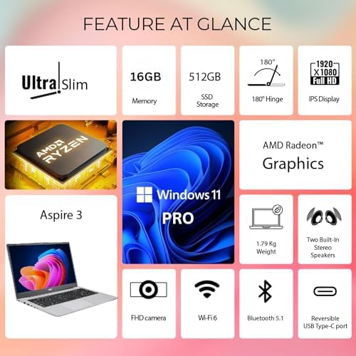 Aspire Premium Slim Laptop - 15.6" Full HD IPS 1080P Display - AMD Ryzen 3 7330U Quad-Core Processor - 16GB RAM - 256GB NVMe SSD - Webcam - Wi-Fi 6 - Windows 11 Pro - W/O Mouse