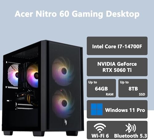 Nitro 60 Gaming Desktop Computer | Intel 20-Core i7-14700F | 32GB DDR5 2TB SSD | NVIDIA GeForce RTX 5060 Ti 16GB GDDR7 DLSS4 (Up to 759 AI Tops) | DisplayPort Wi-Fi 6 Win11 Pro w/DLCA Accessory