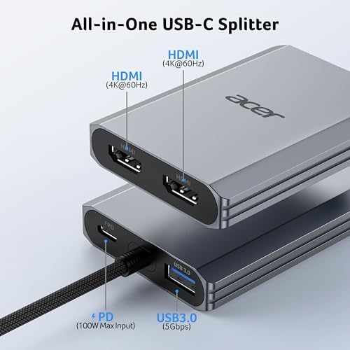 USB C to Dual HDMI Adapter 4K@60Hz, 4-in-1 USB C Hub Multiport Adapter with 100W PD, USB 3.0, Docking Station Dual Monitor, Compatible with Acer, MacBook Air/Pro, Dell XPS, HP, etc