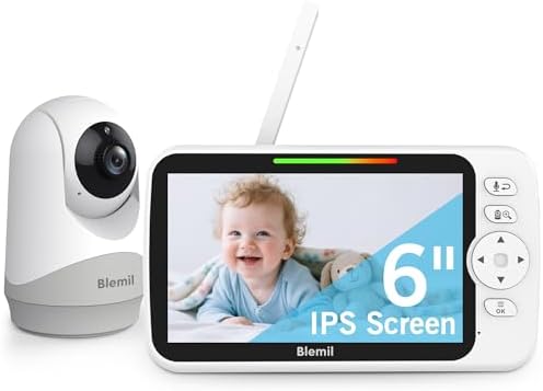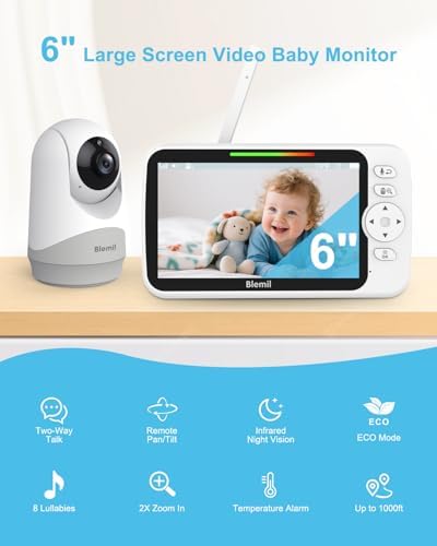 Blemil Upgrade Video Baby Monitor with Camera and Audio 6" Large Screen, 35-Hrs Battery, No WiFi Baby Monitor, Remote Pan/Tilt/Zoom Camera, 2-Way Talk, Night Vision, Temperature, 1000ft Range