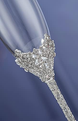 Champagne Flutes - Crystal Glass Metal Base With Crystal Stones, Set of 2 Toasting Flute Pair, Wedding Anniversary Party Birthday Banquets and Gifts for Bride and Groom(Silver)