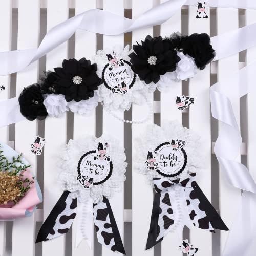 JOYMEMO Cow Baby Shower Sash - Maternity Sash Kit with Mom to Be Dad to Be Corsage Pins, Cow Gender Reveal Pregnancy Flower Belly Belt Photo Props New Parents Keepsake, Farm Cow Print Party Decor