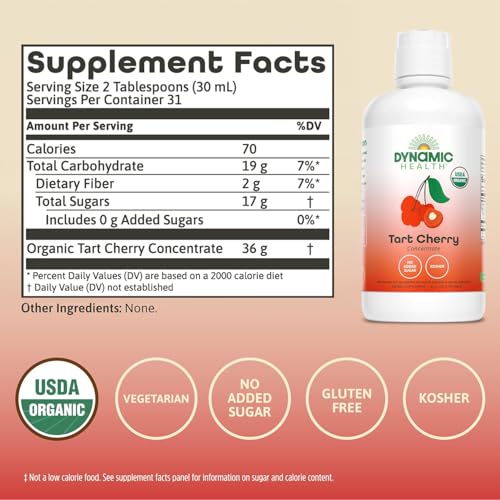 Dynamic Health Organic Tart Cherry Juice, Unsweetened 100% Juice Concentrate, Antioxidants Supplement, No Sweeteners or Additives, Vegan, Gluten Free, BPA Free, 32 oz