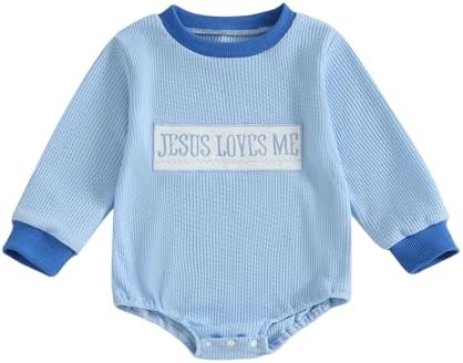 Baby Boy Fall Clothes Jesus Loves Me Embroidery Rompe Oversized Long Sleeve Bodysuit Newborn Waffle Christian Outfit
