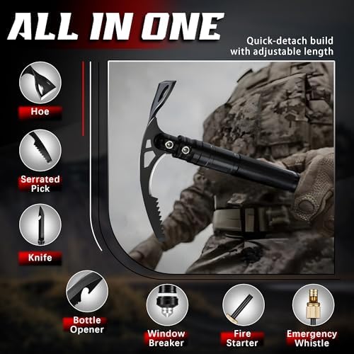 Pick Axe 8 in 1, Folding Pickaxe Mattock with Multi-Purpose Garden Hoe and Survival Knife, Stainless Steel Pick Axes for Digging, Ice Chipping and Weeding