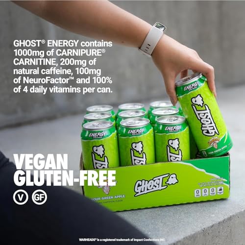 Energy Drink - 12-Pack, Warheads Sour Green Apple, 16oz - Energy & Focus & No Artificial Colors - 200mg of Natural Caffeine, L-Carnitine & Taurine - Gluten-Free & Vegan