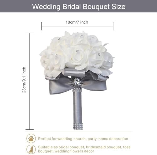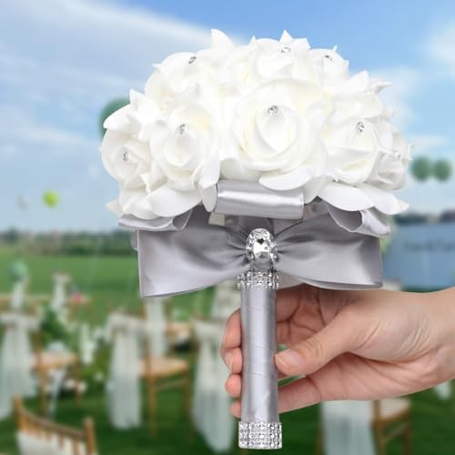 Sponsored Ad - Wedding Bouquets for Bride,9 x 7 in Bridal Bridesmaid Holding Flowers with Crystal Diamond and Soft Ribbons,White Rose Bridal Flowers,Bridesmaid Hand Flowers,Artificial Bouquet (Gray)