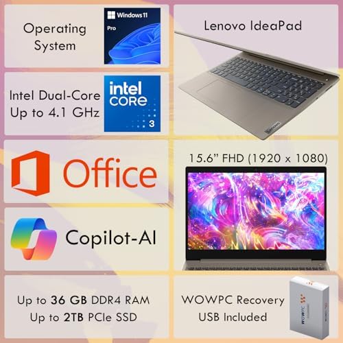 Ideapad Business Laptop | Intel Core i3 Processor (Up to 4.1 GHz) | 15.6" FHD Display | 12GB RAM | 256GB SSD | SD Card Reader | Microsoft Office | Windows 11 Pro | Copilot AI-Ready | WOWPC USB