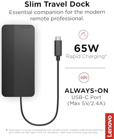 Lenovo USB-C Slim Travel Dock, 8 Ports, Up to 65W PD Pass Through, Integrated USB-C Cable, 4K Display Support, Black