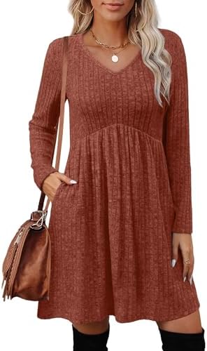 OFEEFAN Long Sleeve Sweater Dress Fall Dresses 2025 V Neck Empire Waist Baby Doll Dresses Women Casual Dress with Pockets
