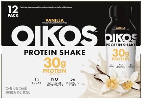 Sponsored Ad - Oikos Protein Shake, Vanilla, 30g High Protein Drinks, Shelf Stable, Ready to Drink, 5g Prebiotic Fiber, 12 fl oz Bottle, 12 Count​