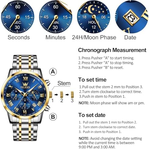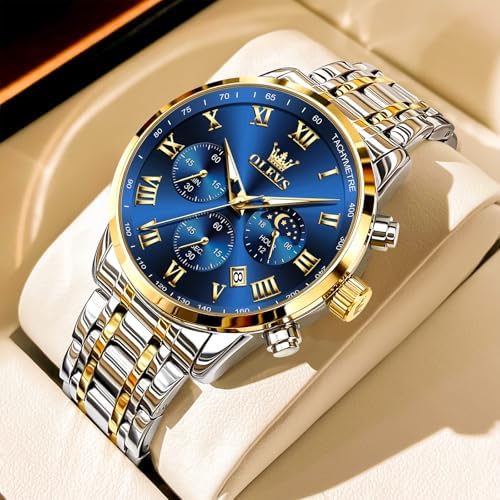 Mens Stainless Steel Chronograph Watch, Big Face Roman Numerals Date Analog Quartz Dress Watches for Men, Fashion Multifunctional Waterproof Luminous Hands Men's Wristwatch