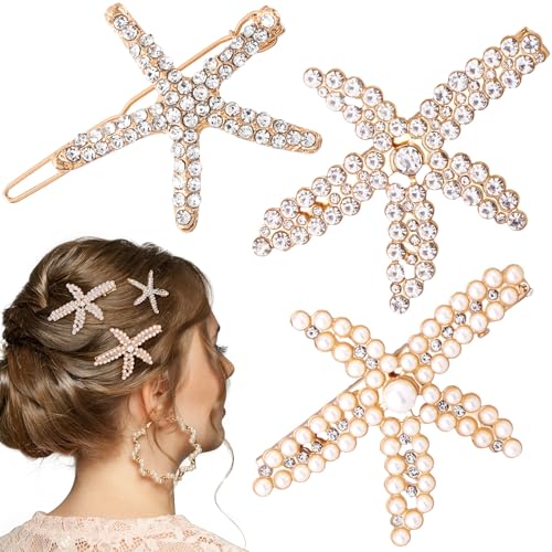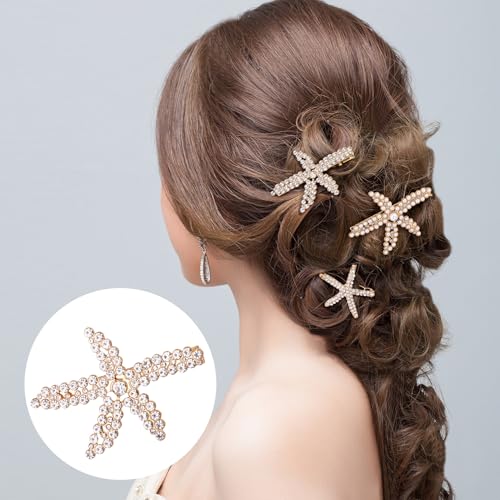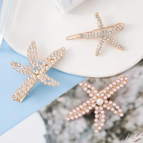 PAGOW 3 PCS Starfish Hair Clips, Gold Pearls Rhinestone Hair Clips, Crystal Sea Star Ponytail Holder, Faux Pearl Crystal Wedding Headpiece Hair Accessories for Women, Bride (3 Styles)