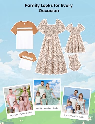 PATPAT Family Matching Outfits Boho Floral Print Square Neck Puff Sleeve Smocked Dress and Short Sleeve T-Shirts Matching Set