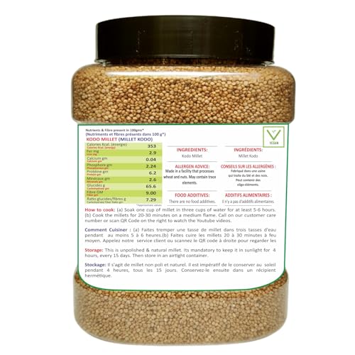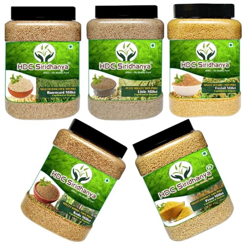 HDC Siridhanya unpolished and organic millets combo pack of 5 USDA Certified Gluten free Kodo, Foxtail, Barnyard, Little and Proso millets, Each millet 2.02lb each packed in Jar total 11lb , 4700g org