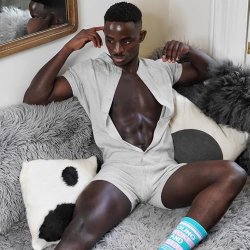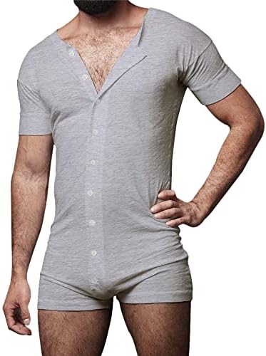 Mens Short Sleeve Onesie Henley Jumpsuit Pajamas Stretchy Cotton One Piece Garment