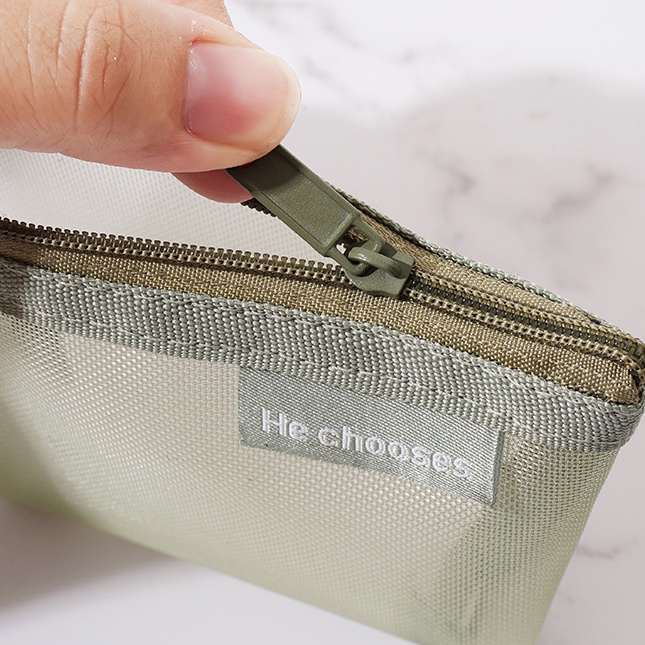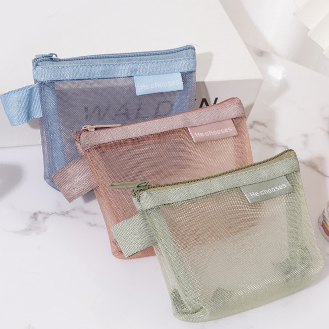 True to description: true Color: blue Material: mesh fabric Convenient, not too small to hold cccd, bank card and 1 other small things, easy to carry, so buy it