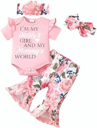 Newborn Baby Girl Clothes Infant Outfits Romper Floral Fall Outfit Bell Bottoms Pant Sets Hat Headband Flowerpant