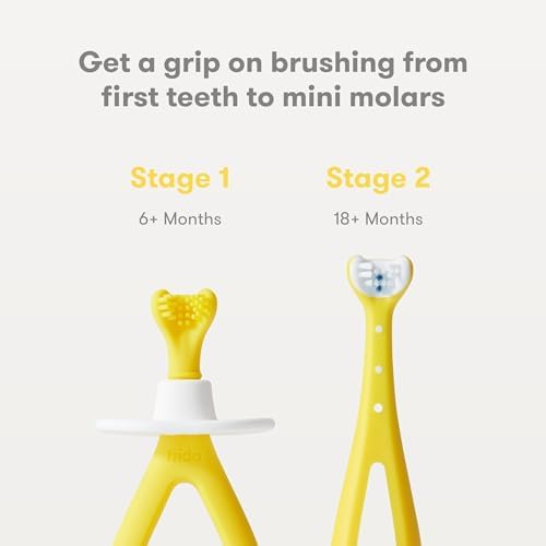 Frida Baby Grow-with-Me Baby Toothbrush Training Set | Infant to Toddler Toothbrush 0-12 months, Cleans All Sides at Once, Oral Care for Sensitive Gums | Yellow