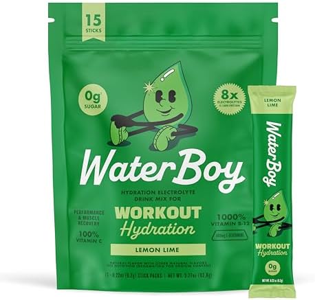 Waterboy Workout Hydration | 2,960mg Sugar Free Electrolyte Powder Packets | L-Glutamine + Vitamins | No Sugar, All Natural, Gluten Free | 15 Drink Stick Mixes (Lemon Lime)