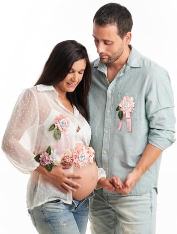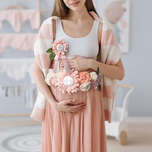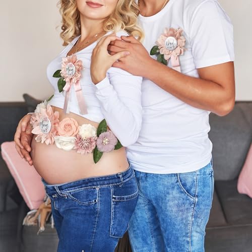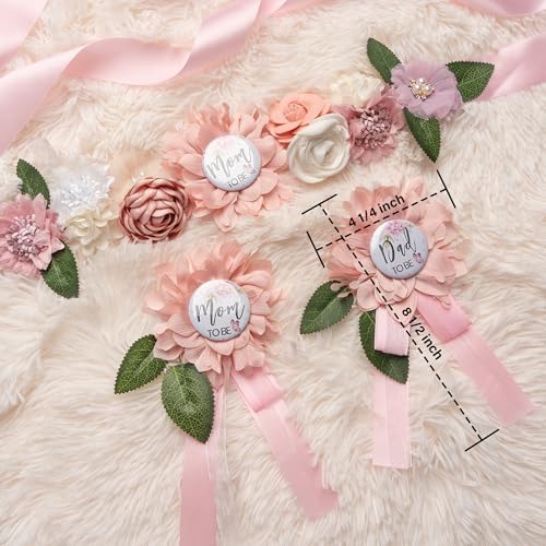 Baby Shower Maternity Sash Belly Belt-Pink Flower Sash Set Mom to Be & Dad to Be Corsage Pins for Gender Reveal