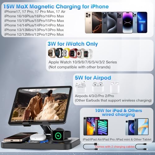 6 in 1 Wireless Charger for Apple Device, 30W Foldable Wired Charging for ipad with Clock & 7 Color Ambient Light, Nightstand Charger Station for iPhone 17/16/15/iWatch Series/AirPods 4/Pro 3(Black)