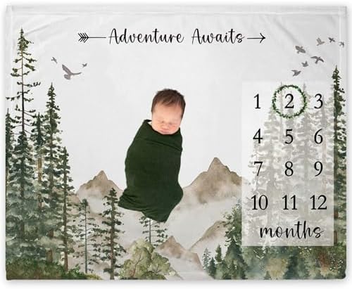 Yuzioey Adventure Awaits Milestone Blanket, Forest Mountain Baby Growth Chart Monthly Blanket, Watch Me Grow Woodland Mountain Tree Baby Nursery Shower(50"x40")